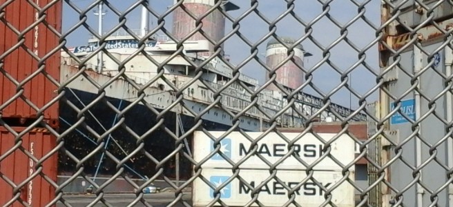 It looms large on the horizon, the hulk of the S.S. United States, as she lies in port in Philadelphia. Her stacks rise above the neighboring dock buildings, and it’s possible to use them as landmarks rather than following GPS directions as you chart a course to see the once grand ship in her current forlorn and decrepit state.