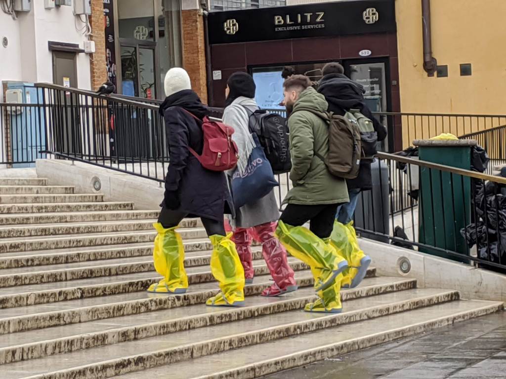 Venetians donned their “Wellies” and rain hats and went about their business. Shopkeepers placed heavy mats inside their doors. Tourists snapped up “fluorescent-colored “cellophane boots with no quibbling over the 10 euro price, pulling them on and wearing them with no embarrassment.