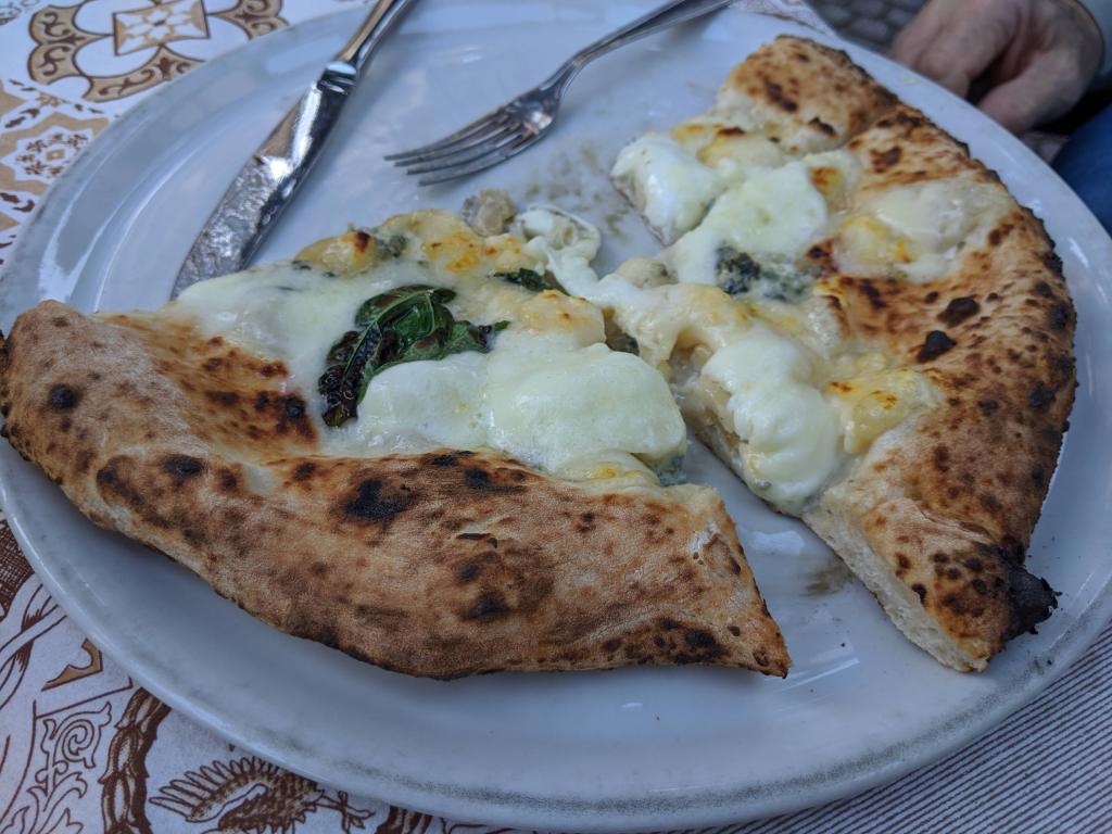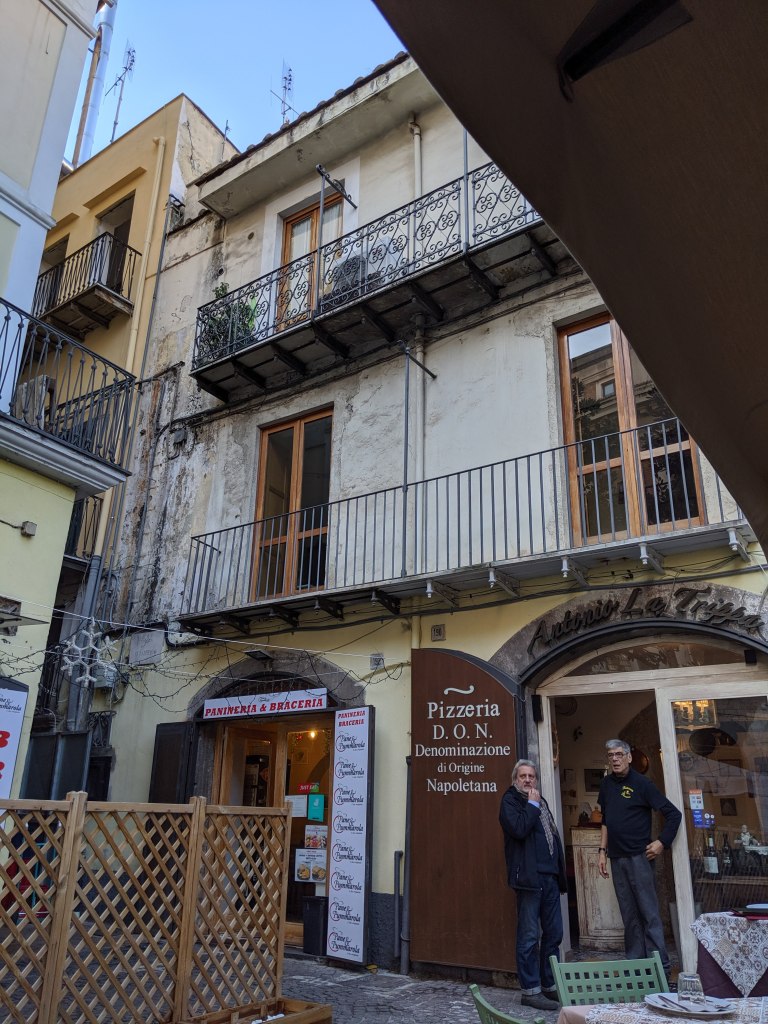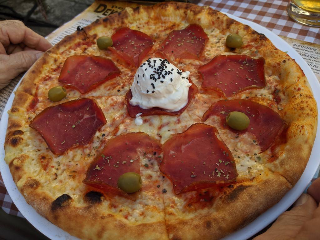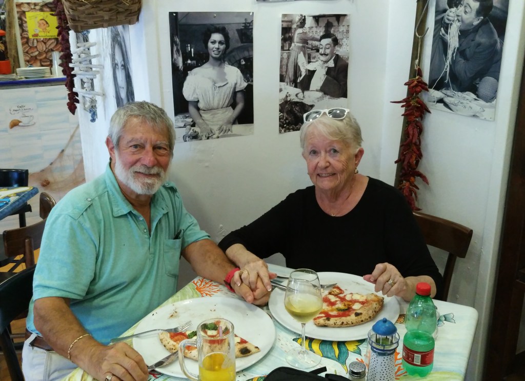 One shouldn’t miss the classic Pizza Margherita when visiting Naples! But there are many other pizza choices in other places. On our European trip in late 2019, we enjoyed pizza several times in distinctive locations, from a seaside restaurant with a stunning view of the Adriatic to a cozy small-town eatery tucked into a centuries-old building in Pula, Croatia. Pizza is a staple at airports across the globe, and during this summer’s pandemic shutdown, a required motel stay in Texas brought us “no contact” pizza delivery from a local take-out-only chain pizza parlor. It was our only option, and we were happy to have it!