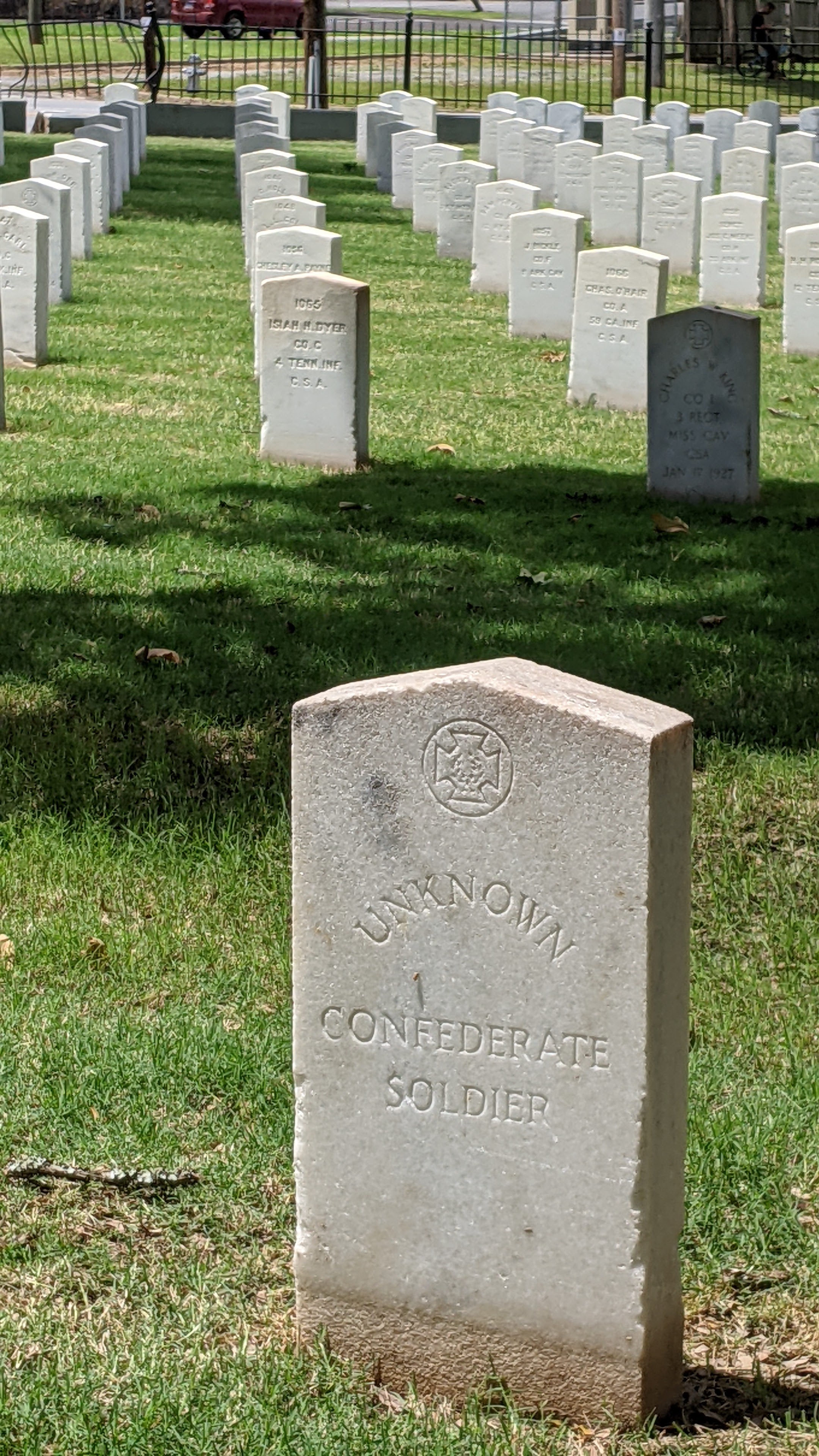 I have written before about my visits to battlefields, and my feelings. I could not help but recall, as I planted small flags aside the headstones of men and women I did not know, those other visits and those other feelings. When the work was done, I took a few moments to walk alone among other markers at the Little Rock Cemetery. Sadly, there were not enough volunteers this year to place flags at all the headstones — many of them date to the Civil War. Separate burial grounds of Confederate and Union soldiers have been incorporated into the grounds of the National Cemetery.