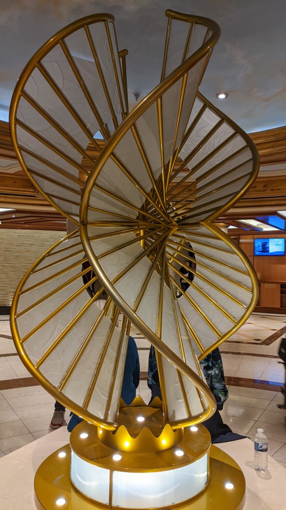 Ours was a short cruise, on an itinerary we had traveled previously. We disembarked at each port, but we thoroughly enjoy the sea days, and have, on previous cruises, remained aboard even while in port. We appreciate the classic lines on the ship, and the familiar public spaces that characterize the ships of the fleet. Princess is one of our favorite cruise lines, so we are familiar with most of the line’s standard offerings, but the Regal has at least a couple of unique features. One is the interior balcony overlooking the casino — it’s possible to watch the action without actually being a part of it!