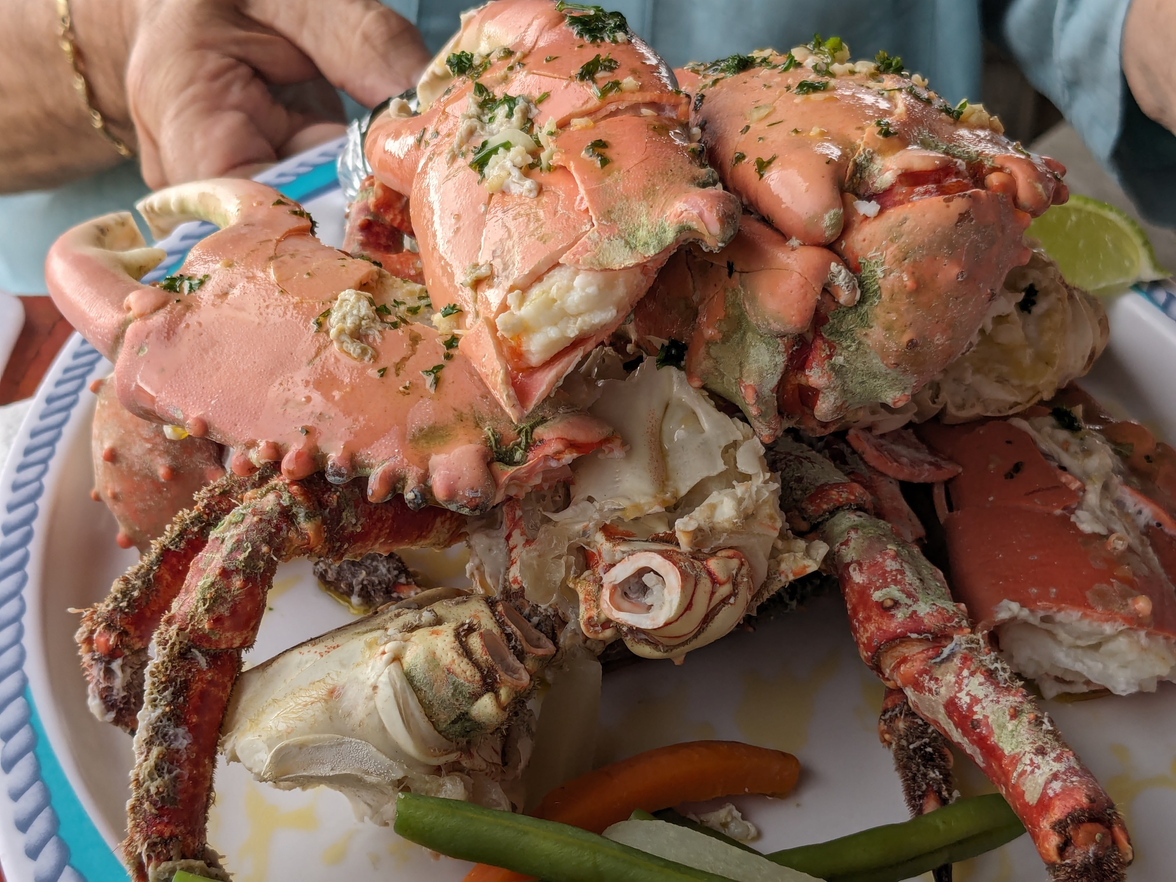 Gio’s is a popular and well-known Roatan establishment that has operated in the same location since 1994. Tourists and islanders alike tout it for the friendly service, the food, the panoramic views, and the laid-back atmosphere. The specialty of the house is Spiny Caribbean King Crab, so that’s what my husband ordered. I ordered what I thought would be a sampler plate of fried plantains and other appetizers. We planned to share. Jorge chose beef and vegetables (perhaps, because he lives on the island, he has his fill of seafood and fish?) In any case, we all were happy!