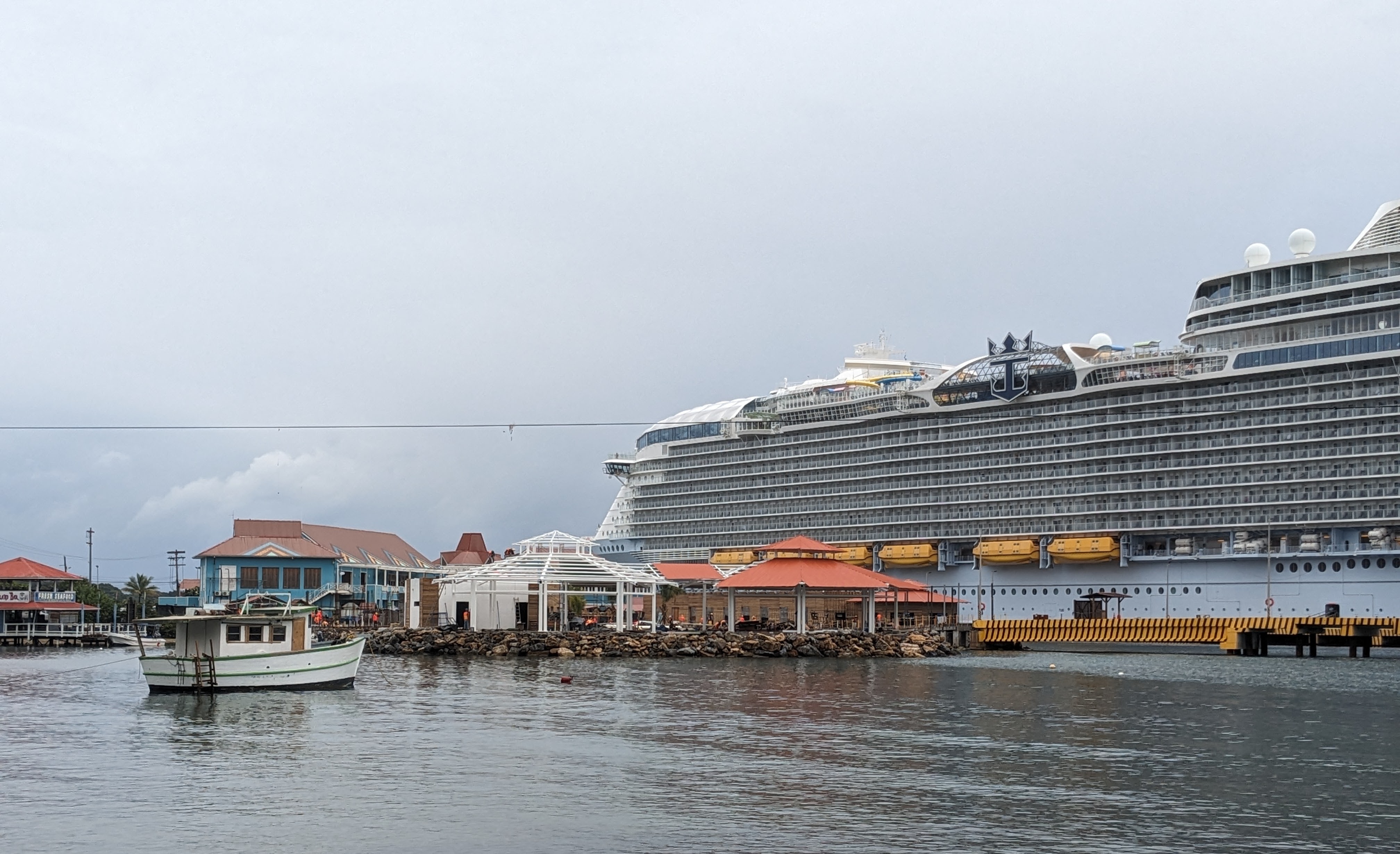 The island’s larger dock is known as the Port at Town Center, situated further west along the coast, adjacent to Coxen Hole, Roatan’s major city. It is used by almost all other cruise lines and can accommodate three large ships at a time, one alongside the dock and two at anchor. The port area is currently being enlarged and improved; construction activity is expected to continue through 2024; perhaps longer. Royal Caribbean’s Wonder of the Seas was alongside the dock at Town Center.